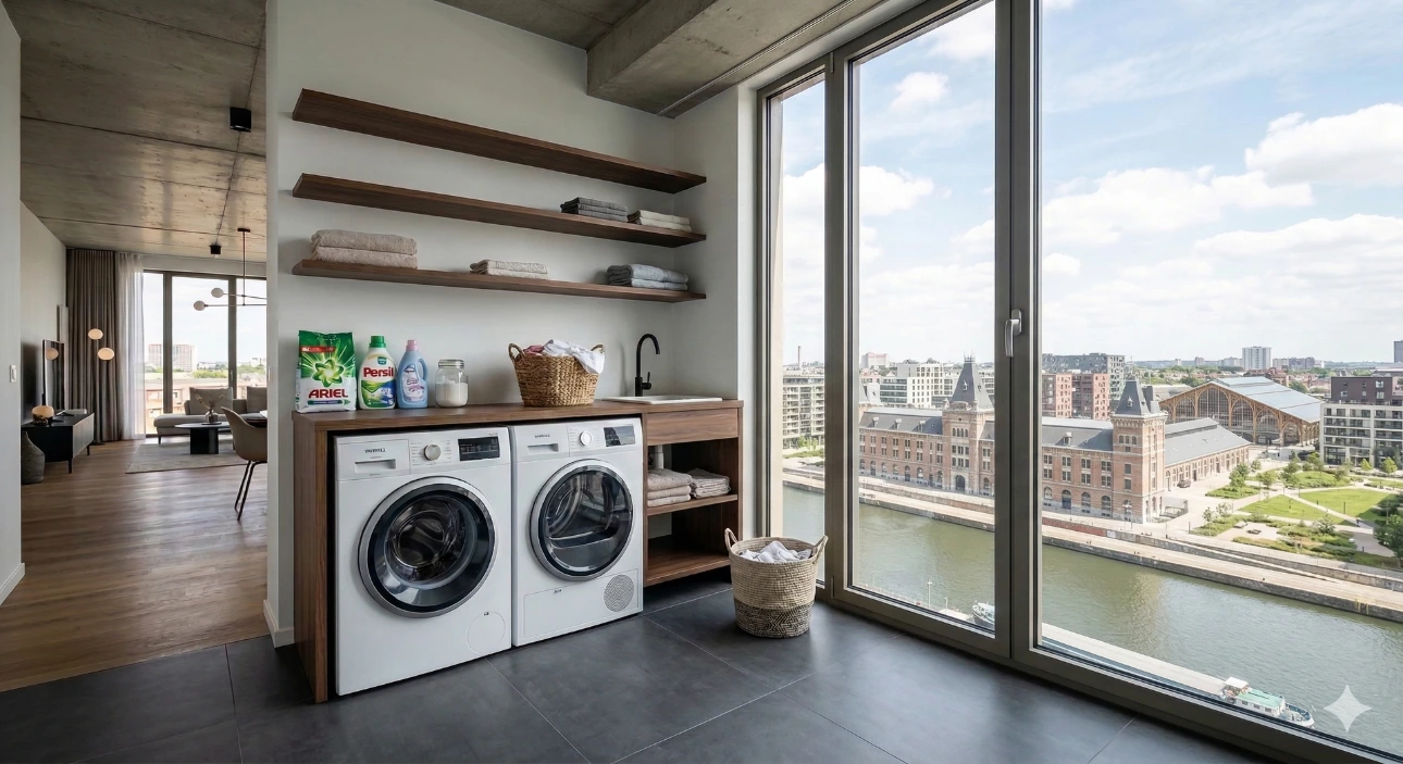 Om het openen van de deur van een wasmachine naast een droogkast te optimaliseren, kan je beide toestellen van plaats wisselen.